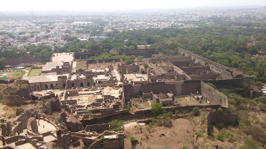 This fort housed a bustling city within its multiple layered fortifications. The complex has three lines of powerful curtain walls, one after the other in succession. The first wall enclosed the town. The second wall snaked around the hill on which the citadel stood. The third wall connected the second wall and the natural boulders which project out of the face of the hill. This triple layered protection along with the acoustic architectural effect presents an epitome of high defense systems. This also served the purpose of effectively guarding the flourishing trade of exquisite gems and diamonds extracted from the mines close by.
