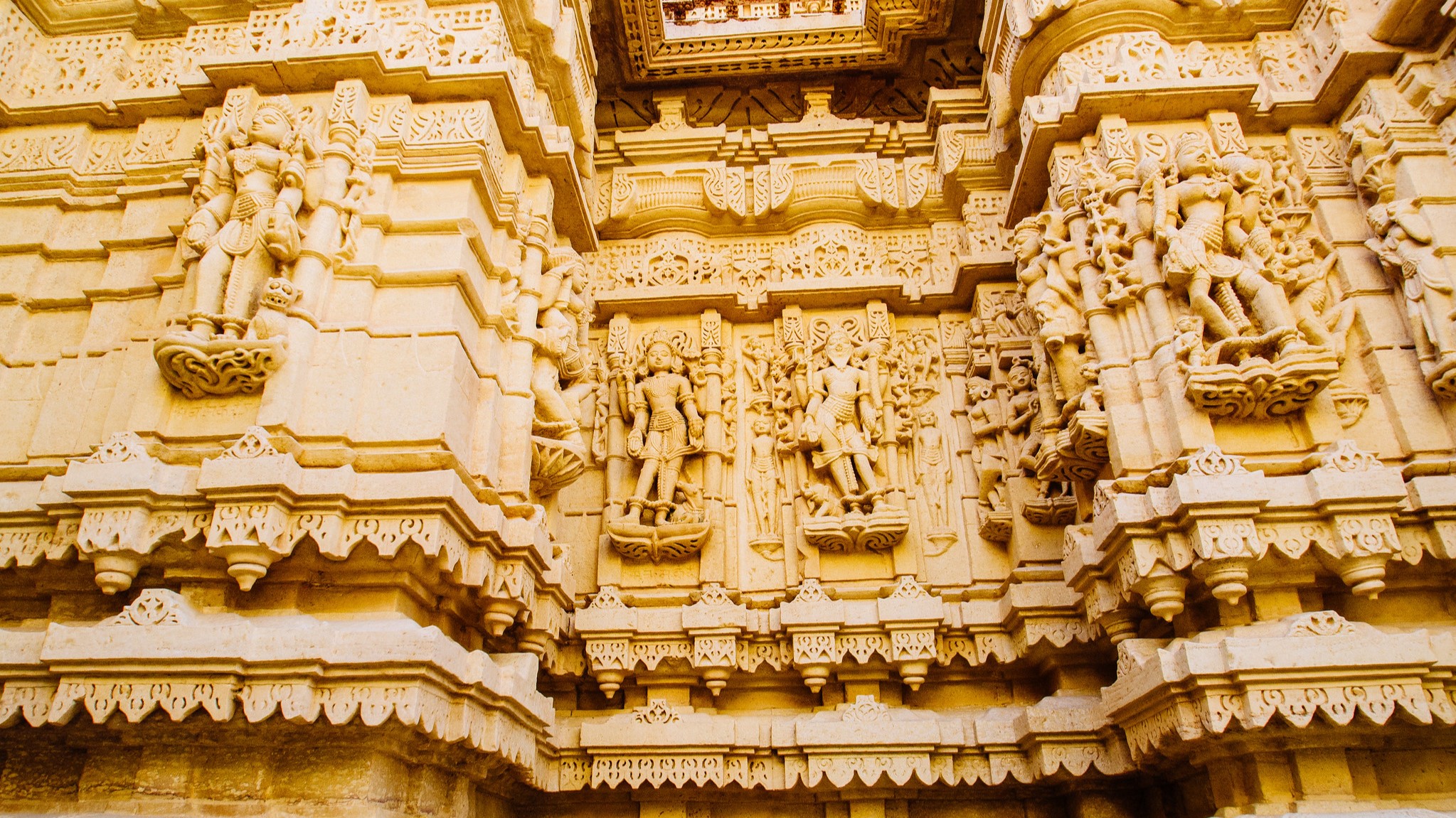 जैसलमेर किले में एक जैन मंदिर की सूक्ष्म नक्काशी से सुसज्जित बाहरी दीवारें। छवि स्रोत- फ़्लिकर