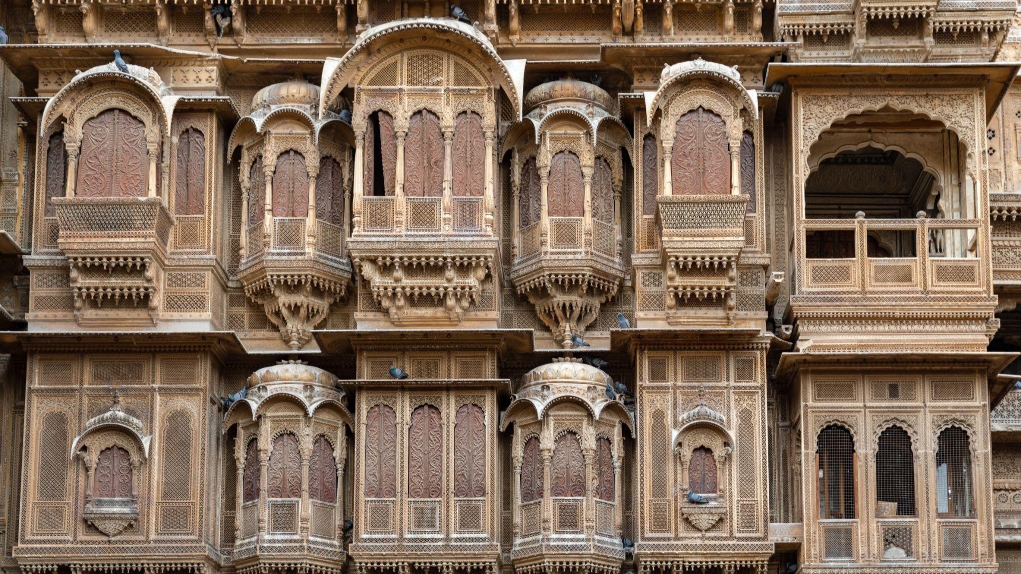 पटवों की हवेली के सूक्ष्मता से तराशे गए झरोखे। छवि स्रोत- फ़्लिकर।