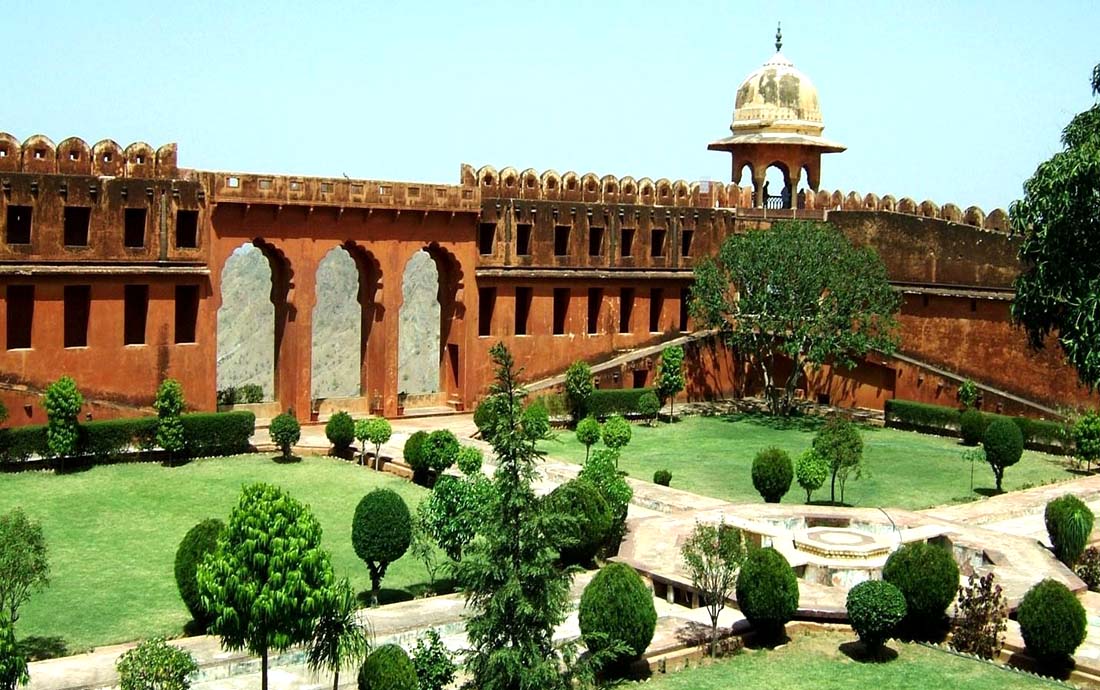 This impregnable fort houses the famous Jaivana and Bajrang-vana cannons. The Jaivana cannon, the world’s largest cannon on wheels, is placed at the Doongar Gate. It was built on the orders of Raja Jai Singh II and has been used only once to test its range. It is believed that the test fire required 100 kgs of gunpowder and 50 kgs of iron and covered a distance of 35 kilometres. This resulted in a massive depression which subsequently got filled with rainwater. The barrel weighs 50 tons and its length is 20.2 feet. The barrel is adorned with carvings of trees, an elephant scroll and a pair of birds. In order to guard the cannon from extreme weather conditions, a tin shed was built. A plaque which is displayed at the entrance to the enclosure provides details on the history of the cannon, its size and its use.